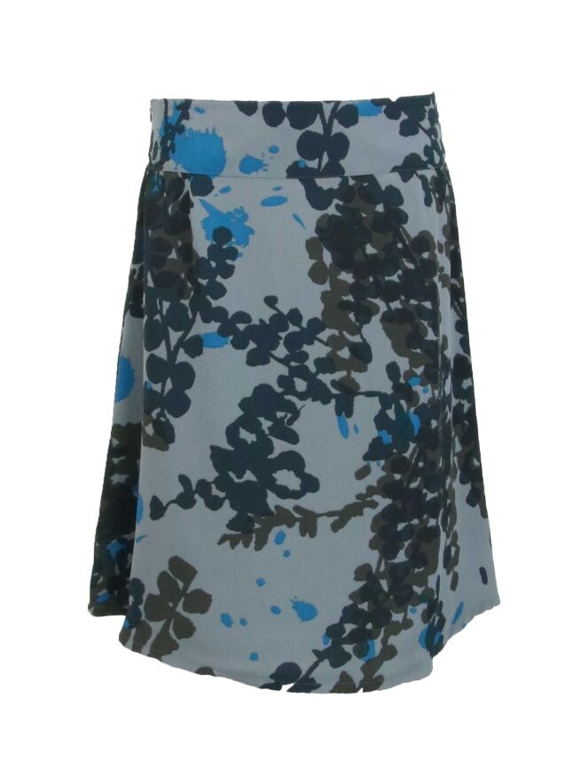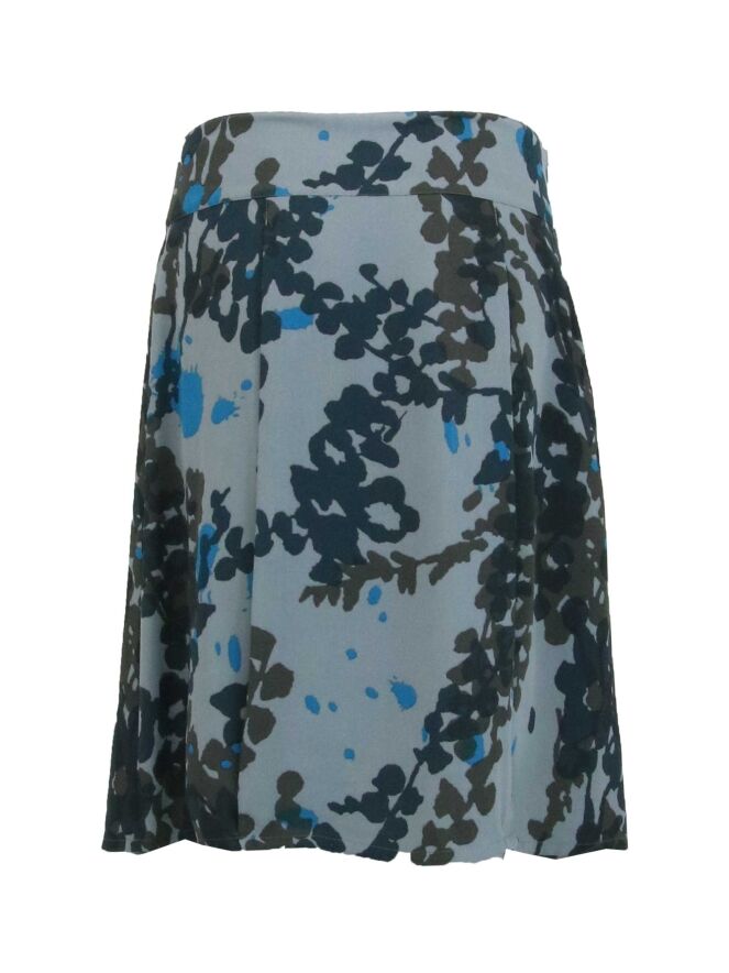 Eine Hosenrock, gestaltet wie ein Rock von Summum, in einem grafischen Blattmuster mit Aquablau und verschiedenen Grautönen. Neben der Mitte der Vorderseite befinden sich zwei Falten, die von der Taille ausgehen. Der Rock ist gefüttert und kann bei 30 Grad gewaschen werden.