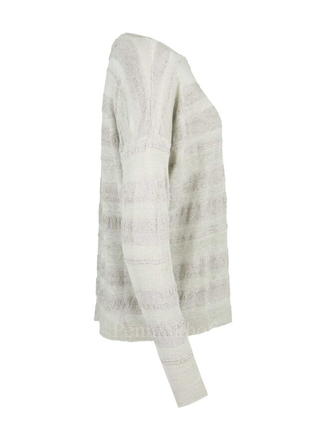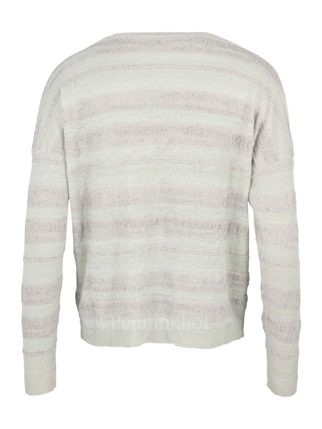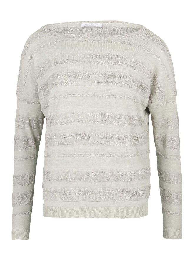 Ein Pullover der Designermarke Tandem mit Streifenmuster in den Farben Camel und Beige, das mit einem goldenen Faden durchzogen ist. Der Pullover hat einen Rundhalsausschnitt und kann bei 30 Grad in der Waschmaschine gewaschen werden.