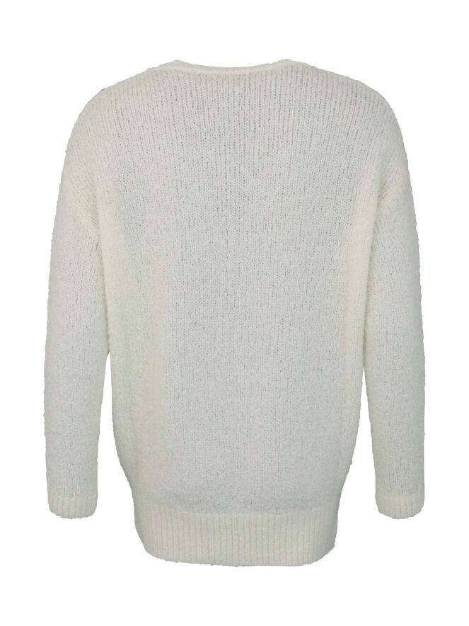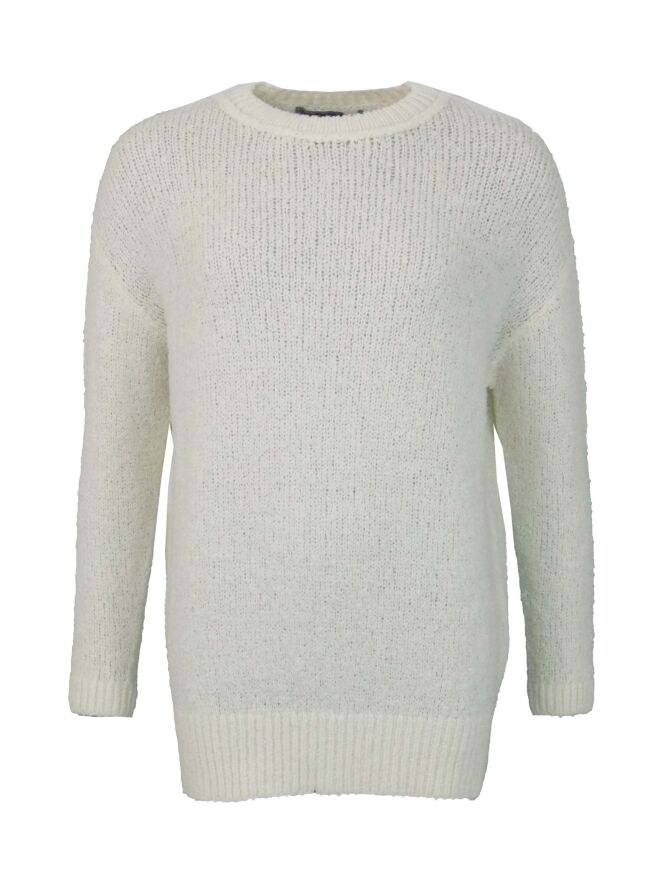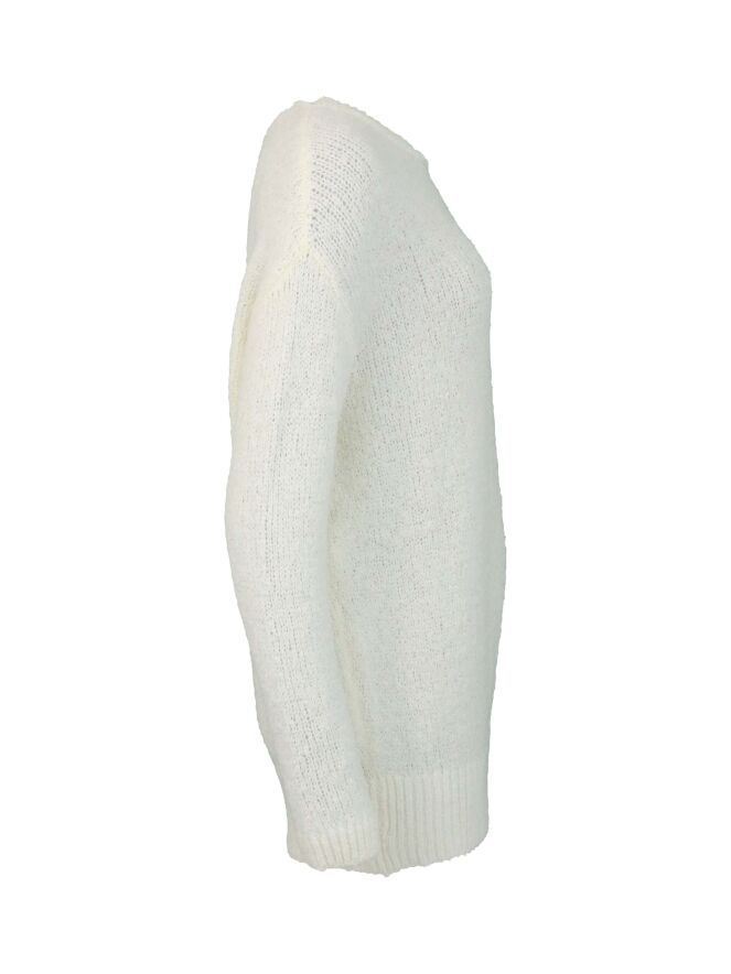 Ein edler langer Pullover der Designermarke Transit in Cremeweiß. Der Rundhalsausschnitt ist mit einem Strickbündchen versehen. Dieser Pullover darf von Hand gewaschen werden.