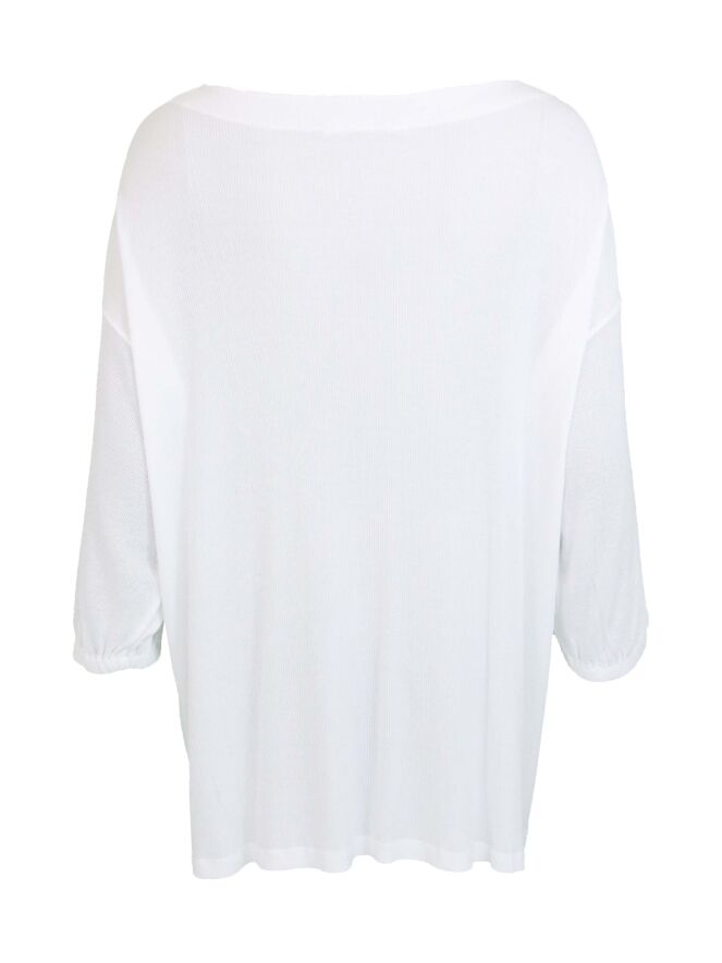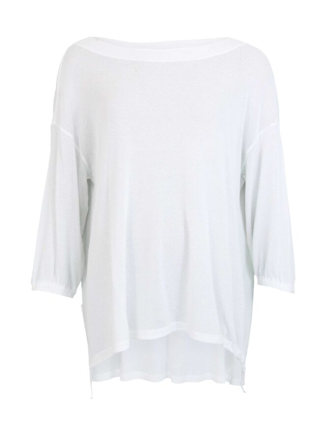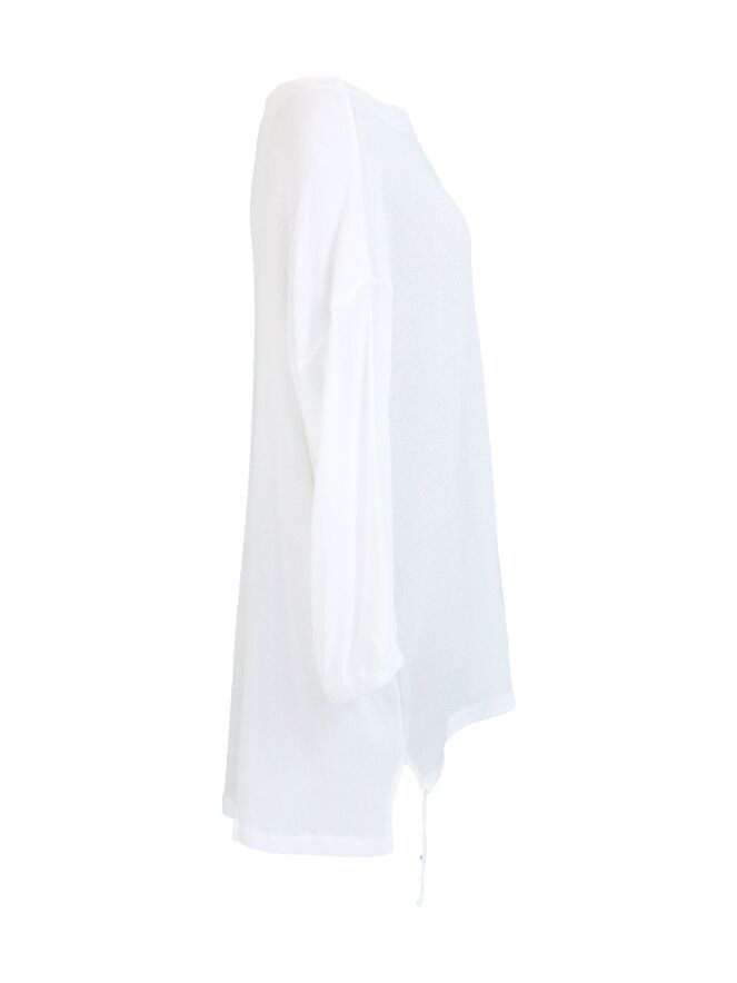 Ein offenmaschiger Strickpullover der Designermarke in Weiß. Vorne ist der Pullover transparent, die Rückseite ist aus einem Feinrippgewebe. Die Kante des Rundhalsausschnitts ist mit einem breiten Bund versehen. Der Pullover hat halblange Ärmel mit Gummizug. Im unteren Saum befindet sich vorne ein Kordelzug. Dieser Pullover kann bei 30 Grad gewaschen werden.