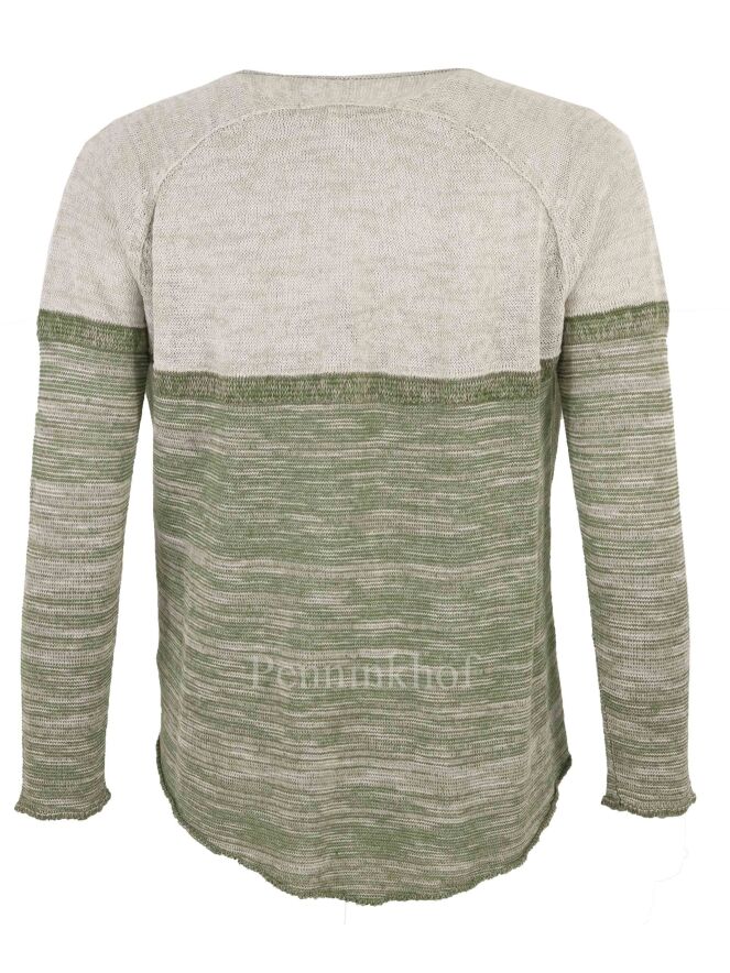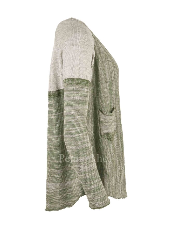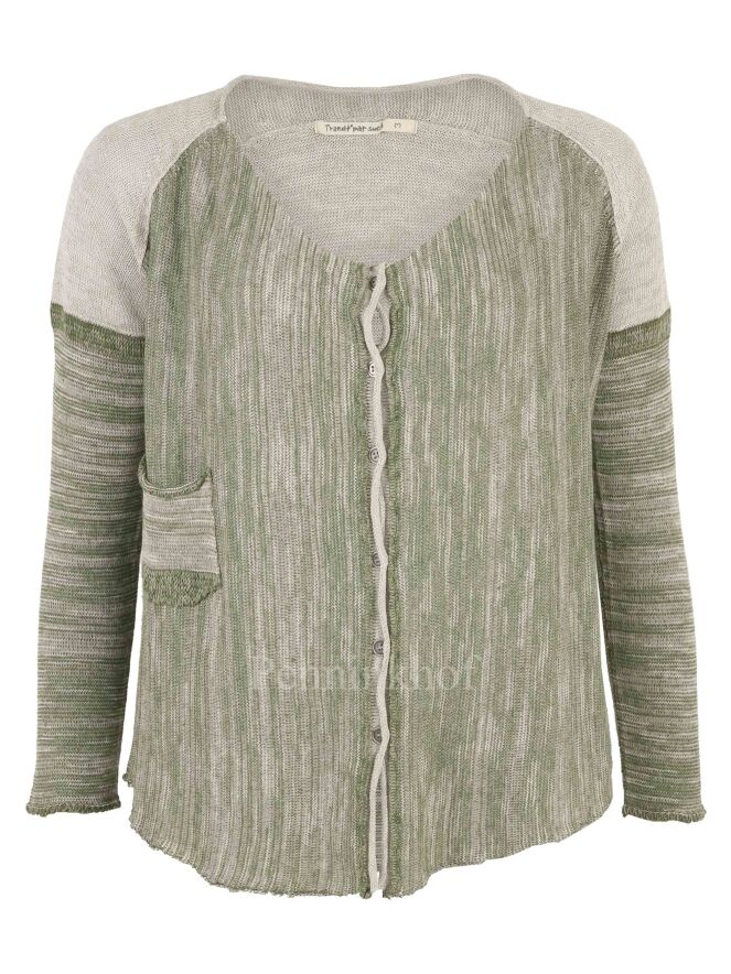 Eine melierte Strickweste der Designermarke Transit in Olivgrün. Die Weste ist an den Schultern beige. An der Kante des Verschlusses verläuft eine beigefarbene Paspel. Diese Strickjacke kann von Hand gewaschen werden.