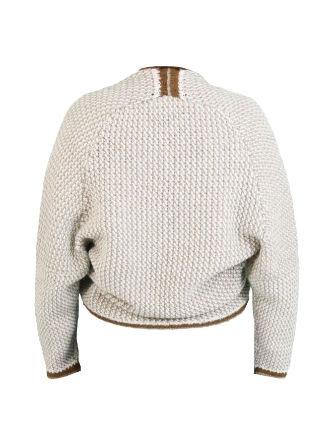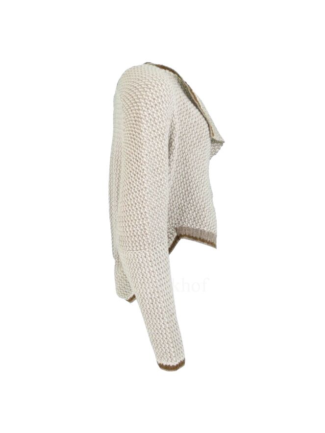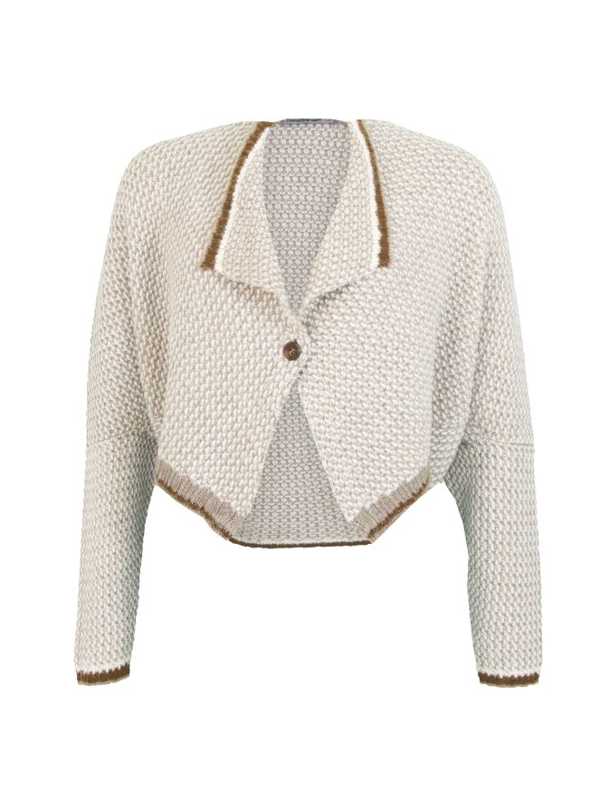 Eine camel-cremeweiß melierte Strickweste der Designermarke Transit. An der Kante des breiten Kragens verläuft ein camel-cremeweißes Trikotbündchen. Die Weste wird mit einem einzelnen Knopf geschlossen und kann von Hand gewaschen werden.