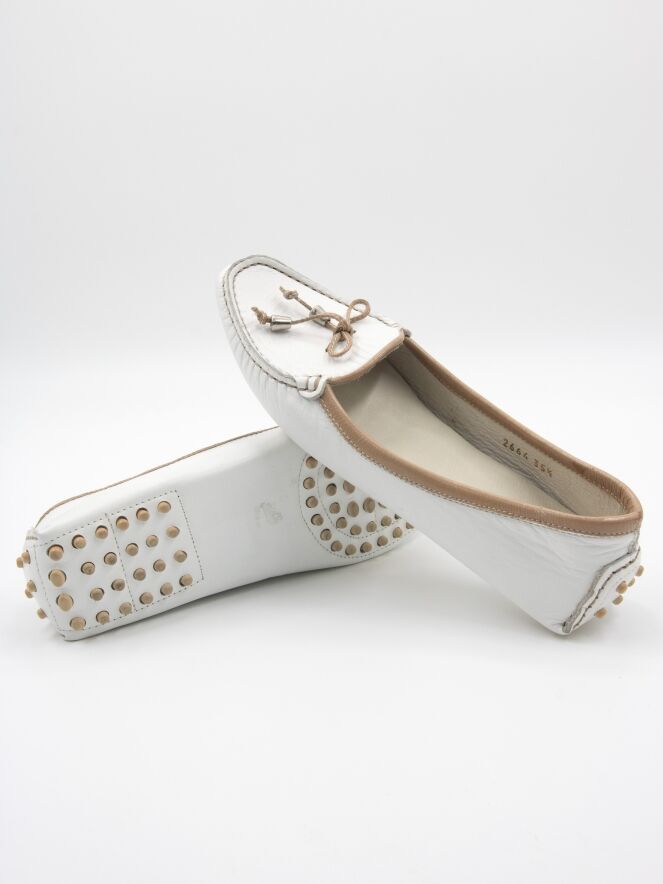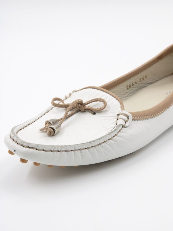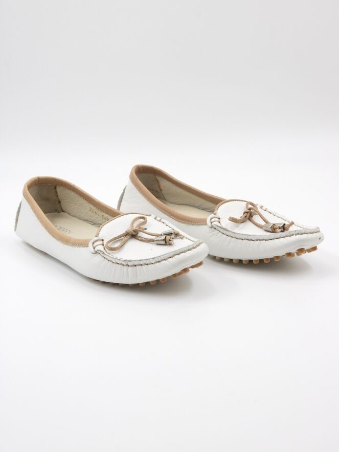 Ein weißer Mokassin von Valentin. Auf dem Vorderfuß befindet sich eine beige Leder-Schleife und entlang des Schafts eine beige Biese.