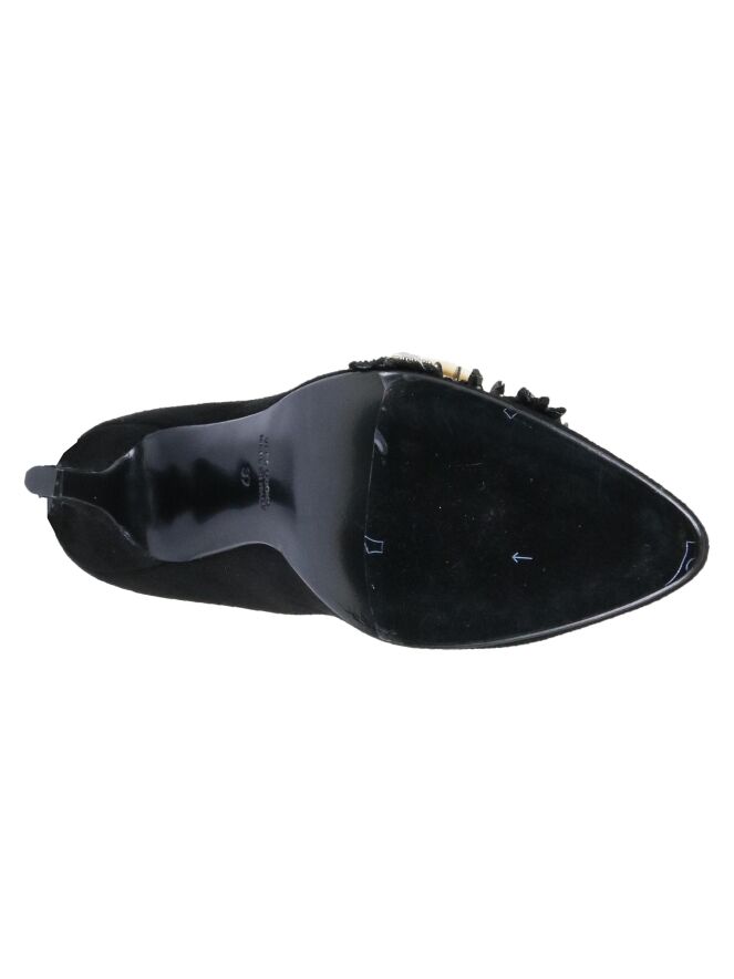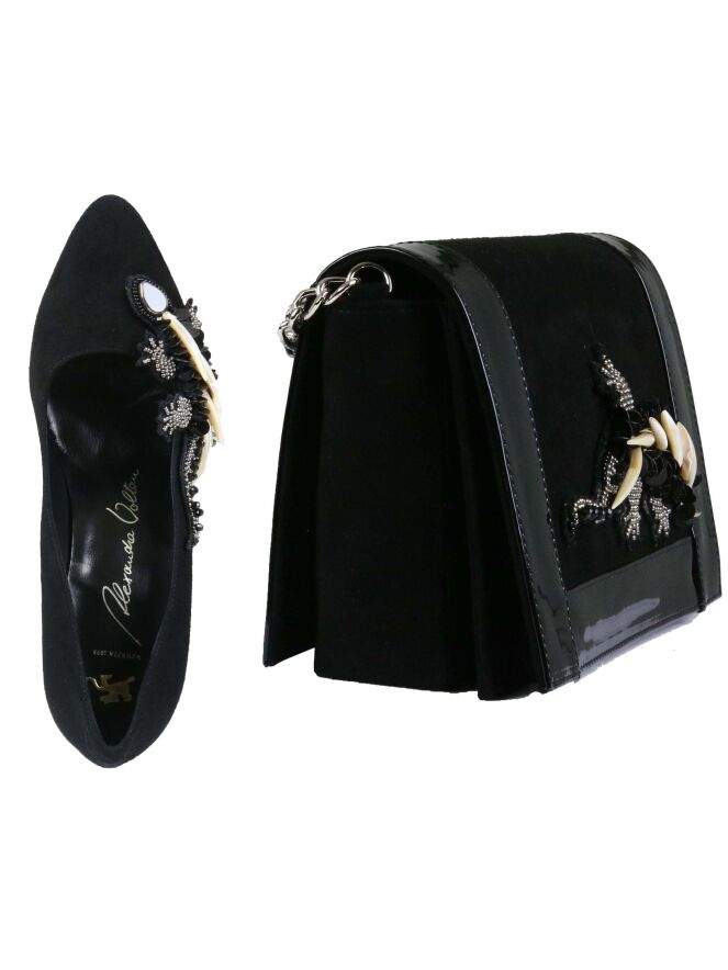 Schwarzer Pumps der Designerschuhmarke Voltan. Der Pumps ist an der Außenseite mit einer edlen, dekorativen Applikation einer Eidechse aus Strass, Pailletten und Horn versehen. Der spitz zulaufende Pumps hat ein Innenfutter aus Leder. Dieser Pumps kommt mit einer passenden Tasche mit Artikelnummer 404000174.