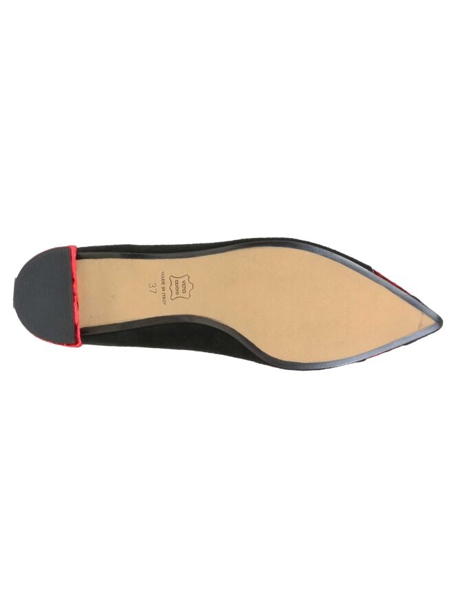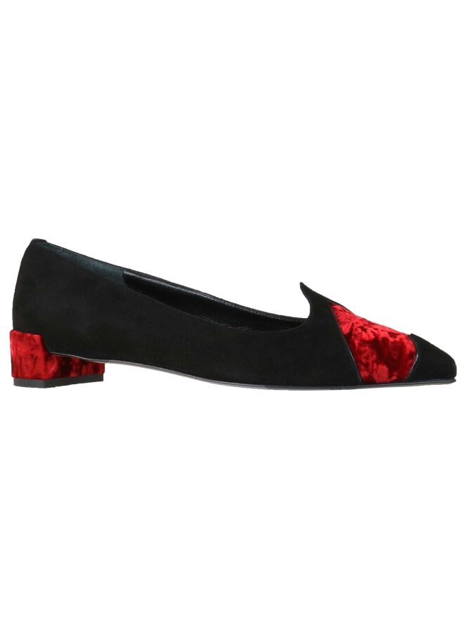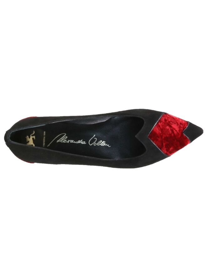 Schwarzer Pumps der Designerschuhmarke Voltan. Roter, dekorativer Samt akzentuiert den Vorfuß. Der Absatz ist mit demselben roten Samt überzogen. Der spitz zulaufende Pumps hat ein Innenfutter aus Leder.