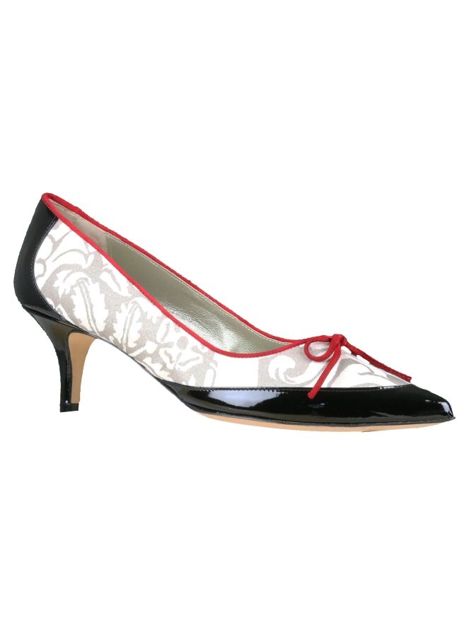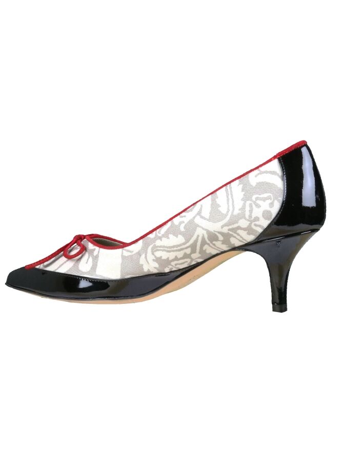 Pumps der Designerschuhmarke Voltan mit Grafik print in Beige und Cremeweiß. Eine bordeauxrote Schleife verziert den vorderen Fußteil. Die Kante des Schuhs ist mit einem Streifen in derselben Farbe versehen. Der Rand des vorderen Fußteils sowie die Schuhspitze, die Ferse und der Absatz sind aus schwarzem Lackleder. Der Pumps hat ein Innenfutter aus Leder. Zu diesen Pumps ist eine Umhängetasche erhältlich in der gleichen Farbgebung mit Artikelnummer 404000169.